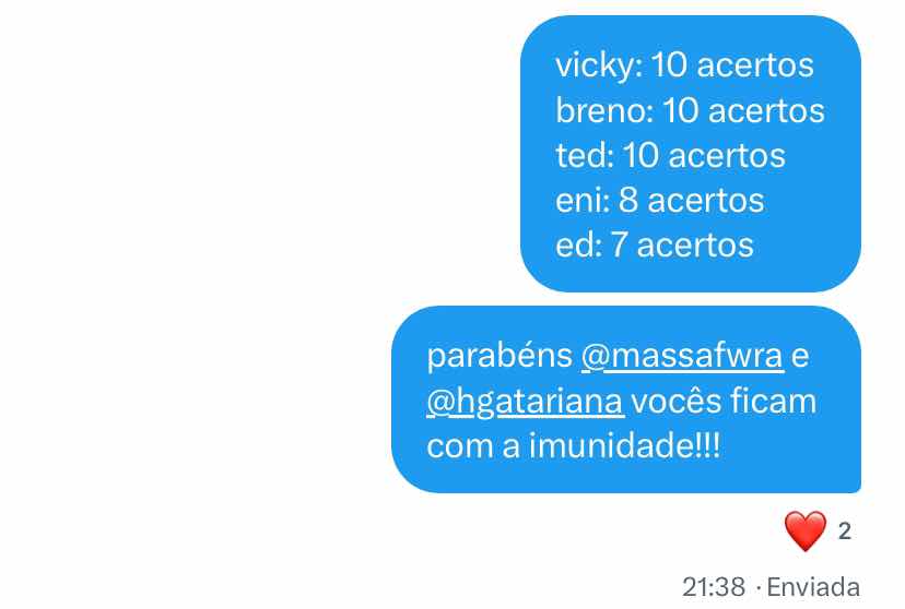 No final das contas, Vicky e Breno foram os que mais acertaram no menor tempo possível, portanto conquistaram a imunidade.