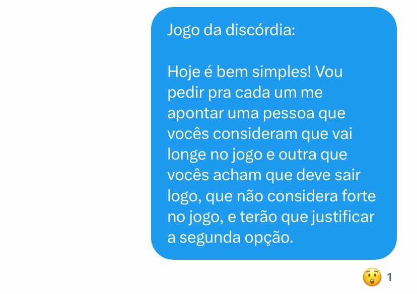 Após as três desistências anunciadas no dia anterior, foi preparado um jogo da discórdia mais “light” para agitar os ânimos dos participantes da casa.